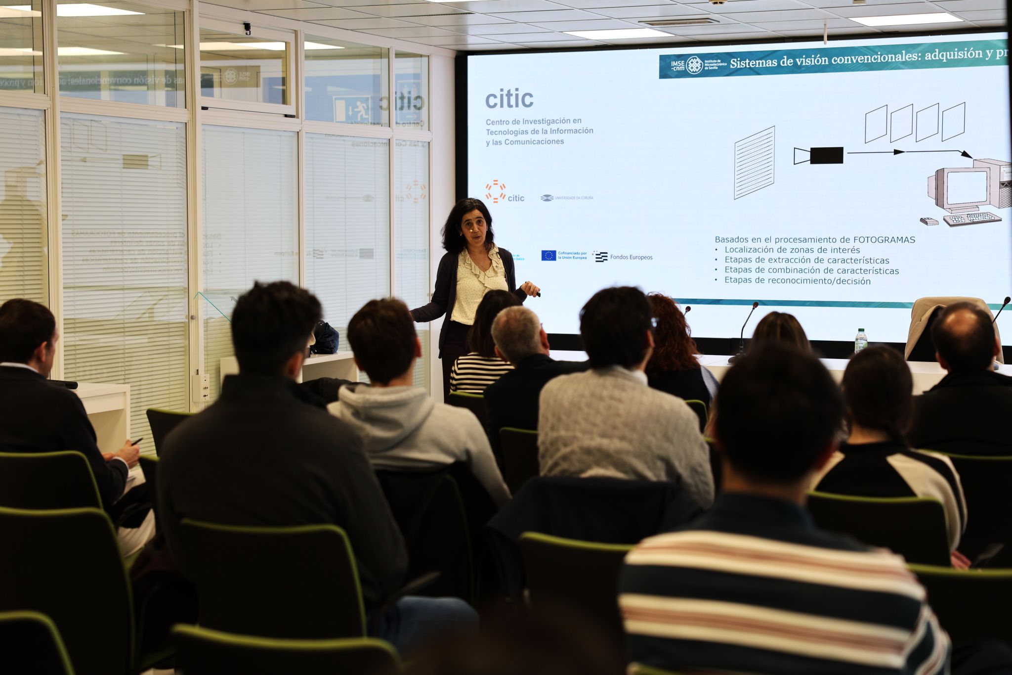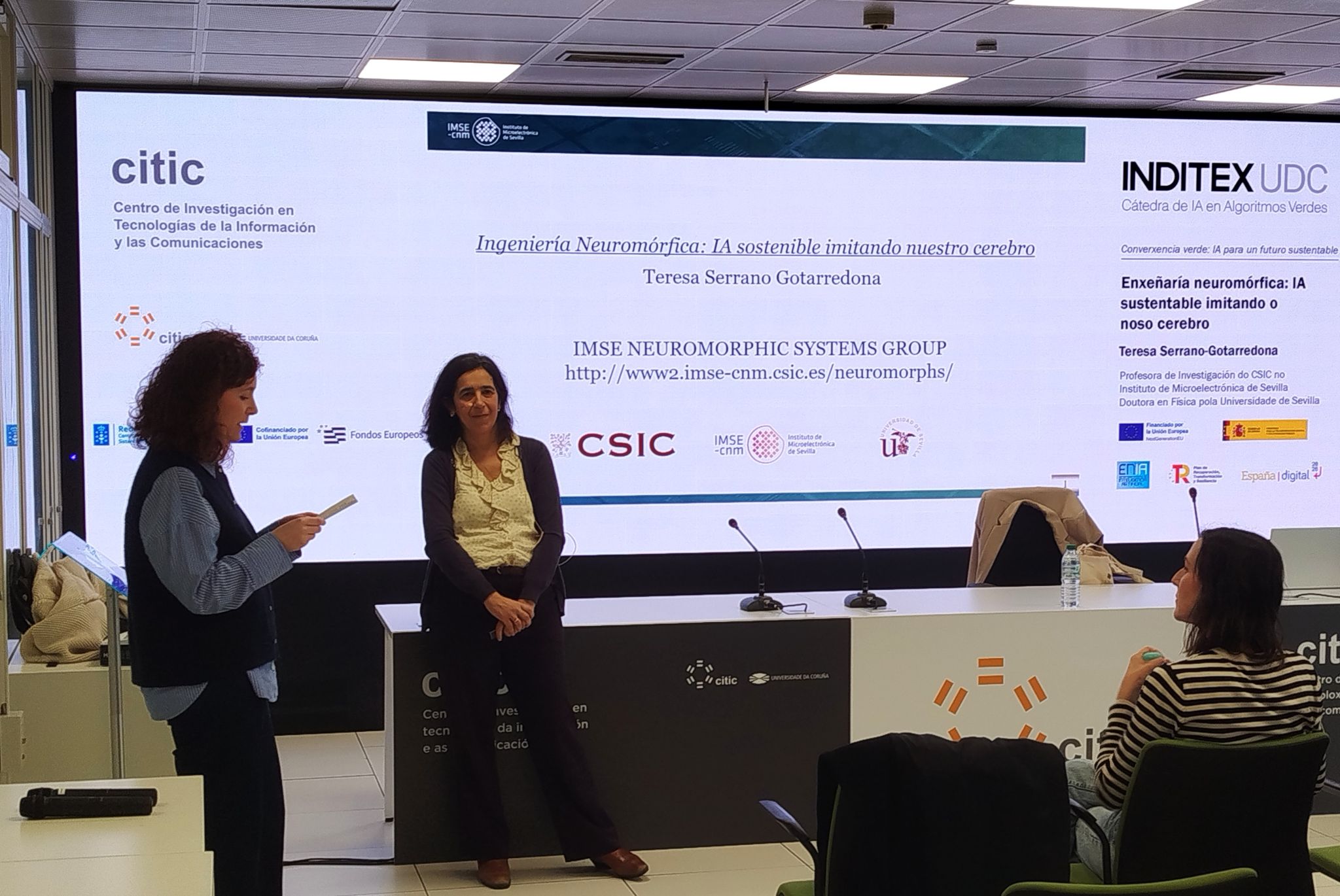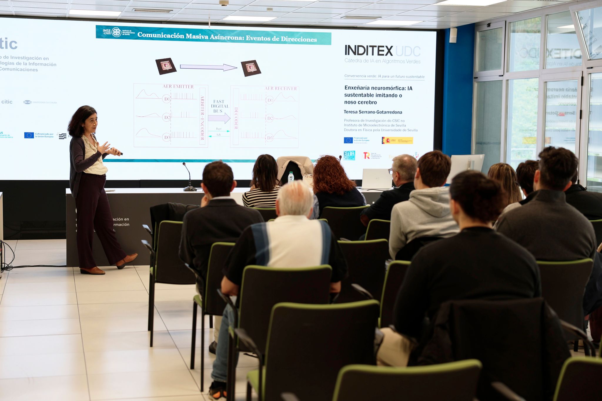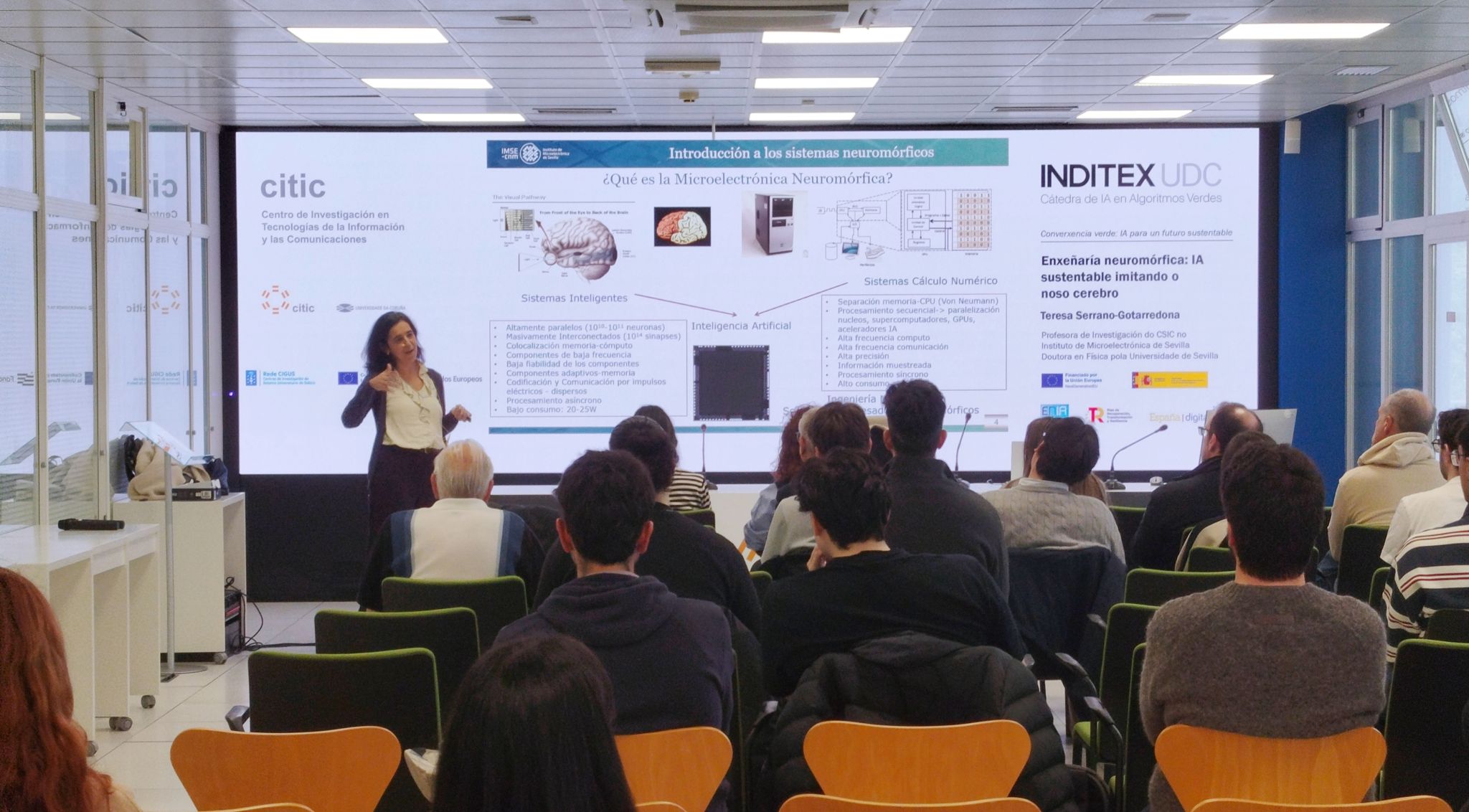 No ciclo Converxencia verde: IA para un futuro sustentable da Cátedra INDITEX UDC de IA en Algoritmos Verdes, tivemos a sorte de contar con Maria Teresa Serrano Gotarredona, investigadora do CSIC, onde é directora do Instituto de Microelectrónica de Sevilla, e posuidora dunha importante traxectoria científica internacional, á que se unen cargos institucionais como o seu paso pola Junta de Andalucía como Directora Xeral de Investigación e Transferencia do Coñecemento.